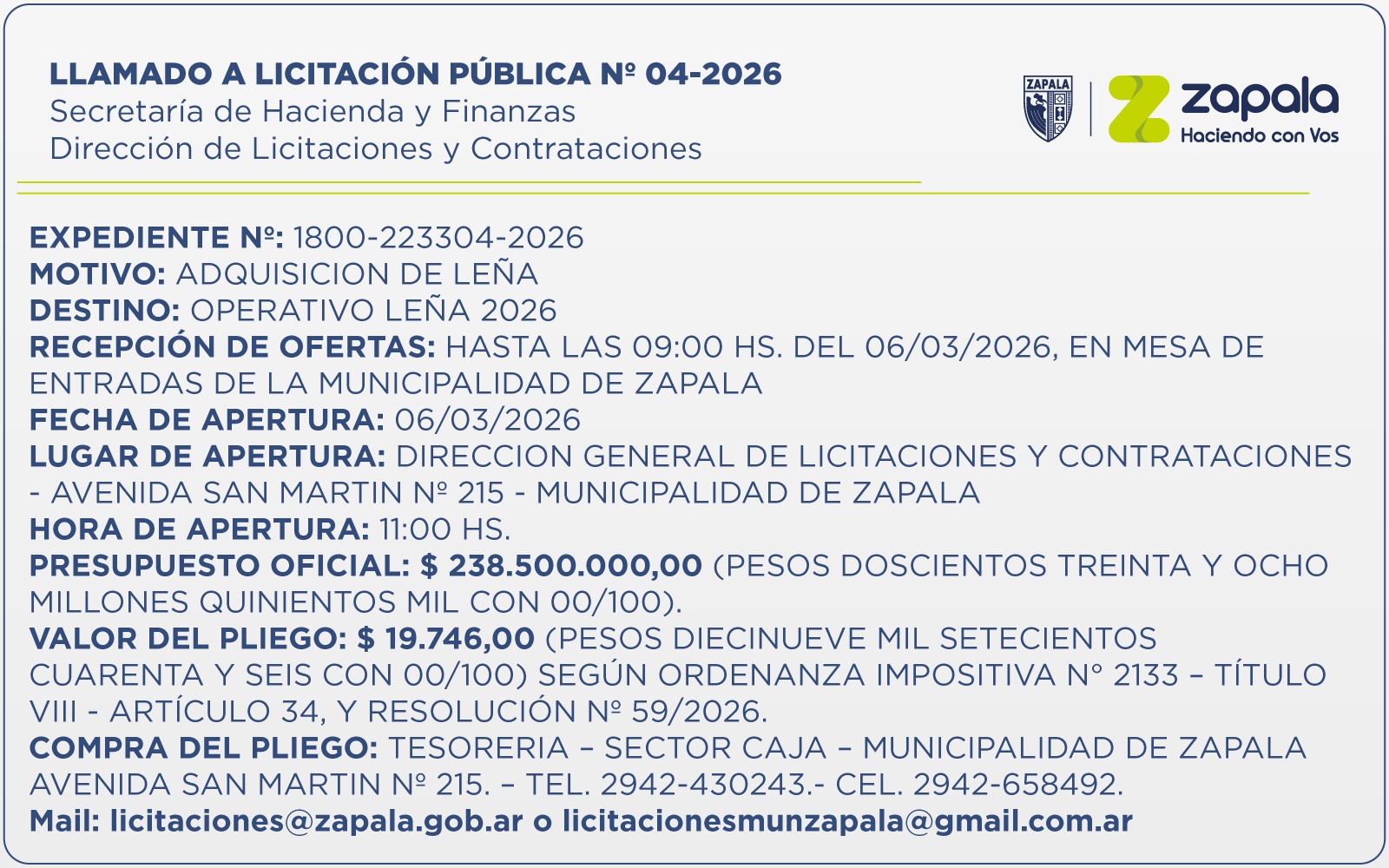 La Secretaría de Hacienda y Finanzas de la Municipalidad de Zapala lanzó el Llamado a Licitación Pública Nº 04/2026, a través de su Dirección de Licitaciones y Contrataciones, para la adquisición de leña destinado al “Operativo Leña”. La recepción de ofertas estará abierta hasta las 9 hs del […]