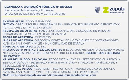 La Secretaría de Hacienda y Finanzas de la Municipalidad de Zapala lanzó el Llamado a Licitación Pública Nº 06/2026, a través de su Dirección de Licitaciones y Contrataciones, el cual está destinado a una obra en la escuela mencionada, que consta de un SUM (Salón Usos Múltiples) con […]
