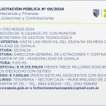 La Municipalidad de Zapala realiza un llamado a licitación pública para la adquisición de quince computadoras con monitor destinadas a la Subsecretaría de Gestión Tecnológica. Desde la Dirección de Licitaciones y Contrataciones, dependiente de la Secretaría de Hacienda y Finanzas de la Municipalidad de Zapala informan que la […]