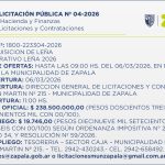 La Secretaría de Hacienda y Finanzas de la Municipalidad de Zapala lanzó el Llamado a Licitación Pública Nº 04/2026, a través de su Dirección de Licitaciones y Contrataciones, para la adquisición de leña destinado al “Operativo Leña”. La recepción de ofertas estará abierta hasta las 9 hs del […]