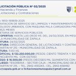 La Secretaría de Hacienda y Finanzas de la Municipalidad de Zapala lanzó el Llamado a Licitación Pública Nº 02/2025, a través de su Dirección de Licitaciones y Contrataciones, la cual estará destinada a la Secretaría de Servicios Públicos con la contratación de servicio de limpieza y mantenimiento del […]