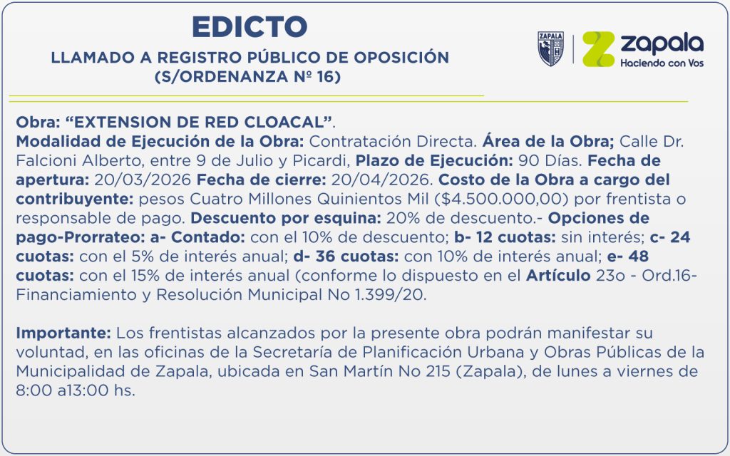 Obra: “PAVIMENTO EN CALLES DE LA CIUDAD DE ZAPALA. EJECUCIÓN DE PAVIMENTO FLEXIBLE”.