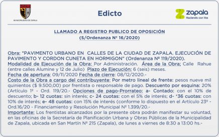 Obra: “PAVIMENTO URBANO EN CALLES DE LA CIUDAD DE ZAPALA. EJECUCIÓN DE PAVIMENTO Y CORDON CUNETA EN HORMIGON” (Ordenanza Nº 119/2020). Modalidad de Ejecución de la Obra: Por Administración. Área de la Obra; Calle Rahue (entre calles Alumine y 12 de Julio) Plazo de Ejecución: 6 (seis) meses. […]