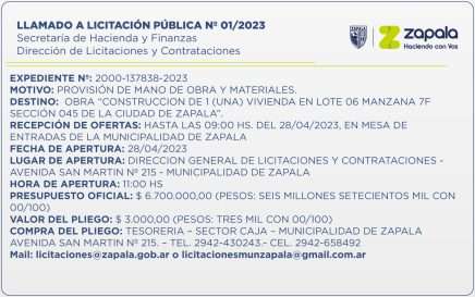 La Secretaría de Hacienda y Finanzas de la Municipalidad de Zapala, a través de la Dirección de Licitaciones y Contrataciones, ha lanzado el Llamado a Licitación Pública Nº 01-2023 para la Provisión de Mano de Obra y Materiales destinados a la construcción de una vivienda en el lote […]