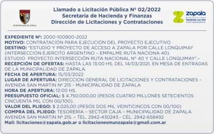 Desde la Dirección de Licitaciones y Contrataciones, dependiente de la Secretaría de Hacienda y Finanzas llaman a licitación para la contratación para ejecución del proyecto ejecutivo. La licitación está destinada a contratar el estudio y proyecto de acceso a Zapala por calle Lonquimay, en intersección de Ejército Argentino […]