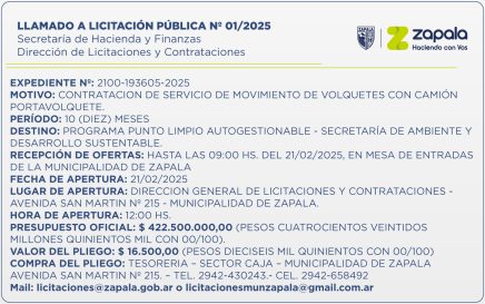 La Secretaría de Hacienda y Finanzas de la Municipalidad de Zapala lanzó el Llamado a Licitación Pública Nº 01/2025, a través de su Dirección de Licitaciones y Contrataciones, la cual estará destinada al Programa Punto Limpio Autogestionable con la contratación de servicio de movimiento de volquetes con camión […]