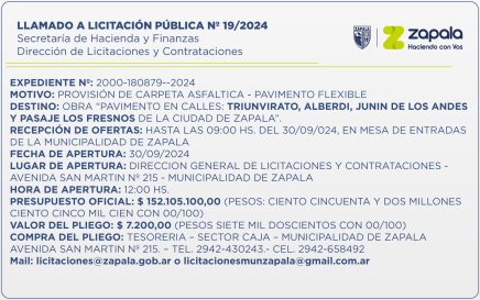 La Secretaría de Hacienda y Finanzas de la Municipalidad de Zapala lanzó el Llamado a Licitación Pública Nº 19/2024, a través de su Dirección de Licitaciones y Contrataciones, la cual estará destinada a la provisión de carpeta asfáltica-pavimento flexible de calles Triunvirato, Alberdi, Junín de los Andes y […]
