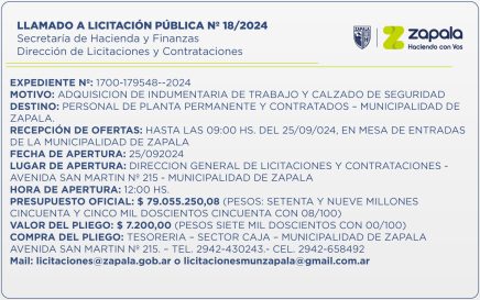 La Secretaría de Hacienda y Finanzas de la Municipalidad de Zapala lanzó el Llamado a Licitación Pública Nº 18/2024, a través de su Dirección de Licitaciones y Contrataciones, la cual estará destinada a la adquisición de indumentaria y calzado de seguridad para trabajadores de planta permanente y contratados. […]
