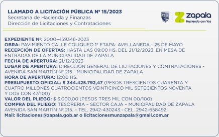 El Municipio realiza un llamado a licitación pública para la obra de pavimentación de calle Coliqueo, en su primera etapa: Avellaneda-25 de Mayo. Desde la Dirección de Licitaciones y Contrataciones, dependiente de la Secretaría de Hacienda y Finanzas de la Municipalidad de Zapala informan que la recepción de […]