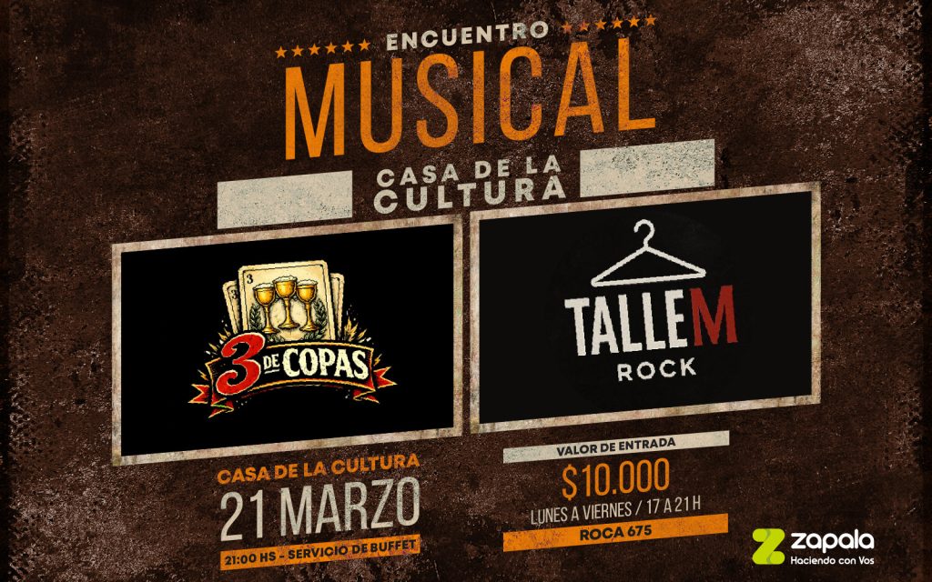 En esta oportunidad, el sábado 21 de marzo la Casa de la Cultura (Roca 675) será el escenario de una velada con doble presentación. Sobre el escenario estarán las bandas “3 de Copas” y “Talle M”, quienes ofrecerán un repertorio que promete ritmo, energía y un show pensado para compartir entre amigos, familia y amantes de la música.